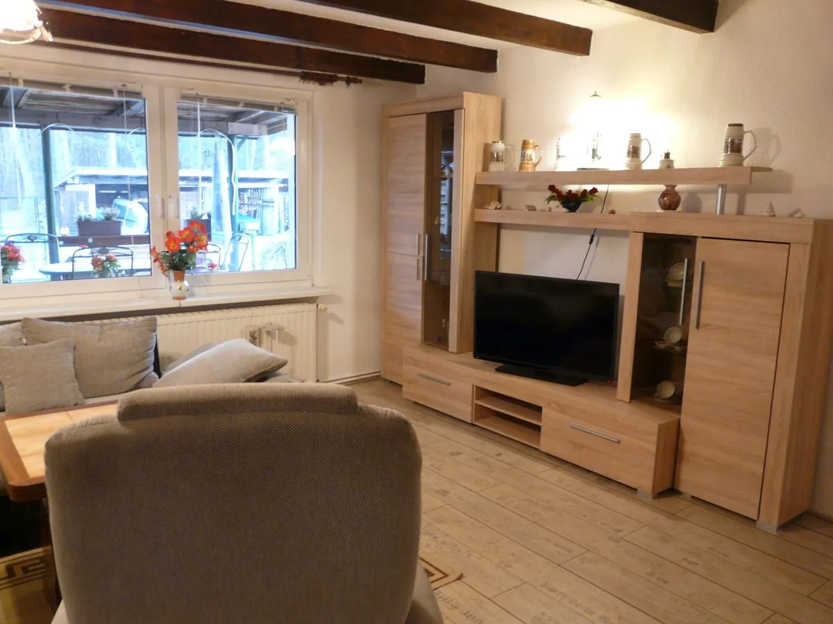 Das 55 m² große Ferienhaus betreten Sie im Flur mit Garderobe, Spiegel, Kleider- und Schuhschrank. Im Wohnzimmer gibt es eine große Couch, die auch zum Schlafen für 2 Personen geeignet ist, sowie einen Sessel, einen Wohnzimmertisch, eine Wohnwand und einen Flachbildfernseher. In der Küche finden Sie einen Vierplattenherd mit Backofen, eine Mikrowelle, einen Geschirrspüler, einen Kühlschrank mit Tiefkühlfach, eine Kaffeemaschine, einen Toaster, einen Wasserkocher und ein Radio mit CD. Hier steht auch der Esstisch mit Stühlen. Von diesem Raum gelangen Sie ins Bad mit einer großen Dusche, WC, Waschtisch, Spiegel, Waschmaschine und einem kleinen Handtuchheizkörper. Das Schlafzimmer ist mit zwei Boxsprigbetten (0,9x2,0 m und 1,4x2,0 m) für insgesamt 3 Personen ausgestattet. Direkt neben der Eingangstür befindet sich Ihre große überdachte Terrasse mit Gartenmöbeln. Hier können Sie auch gerne rauchen. Ein Holzkohle- und ein Gasgrill stehen zur Verfügung. In Absprache mit Ihren Vermietern können Sie auch einen Räucherofen sowie eine Feuerschale nutzen. Da das Haus jedoch direkt am Wald liegt ist bei großer Trockenheit eine Nutzung nicht möglich. Der kleine Gartenteich ist zur Sicherheit eingezäunt. Parkplätze sind auf dem Grundstück vorhanden, ebenso wie ein Räucherofen für Fisch, der bei den passenden Wetterbedingungen und nach Absprache mit den Vermietern, genutzt werden kann.