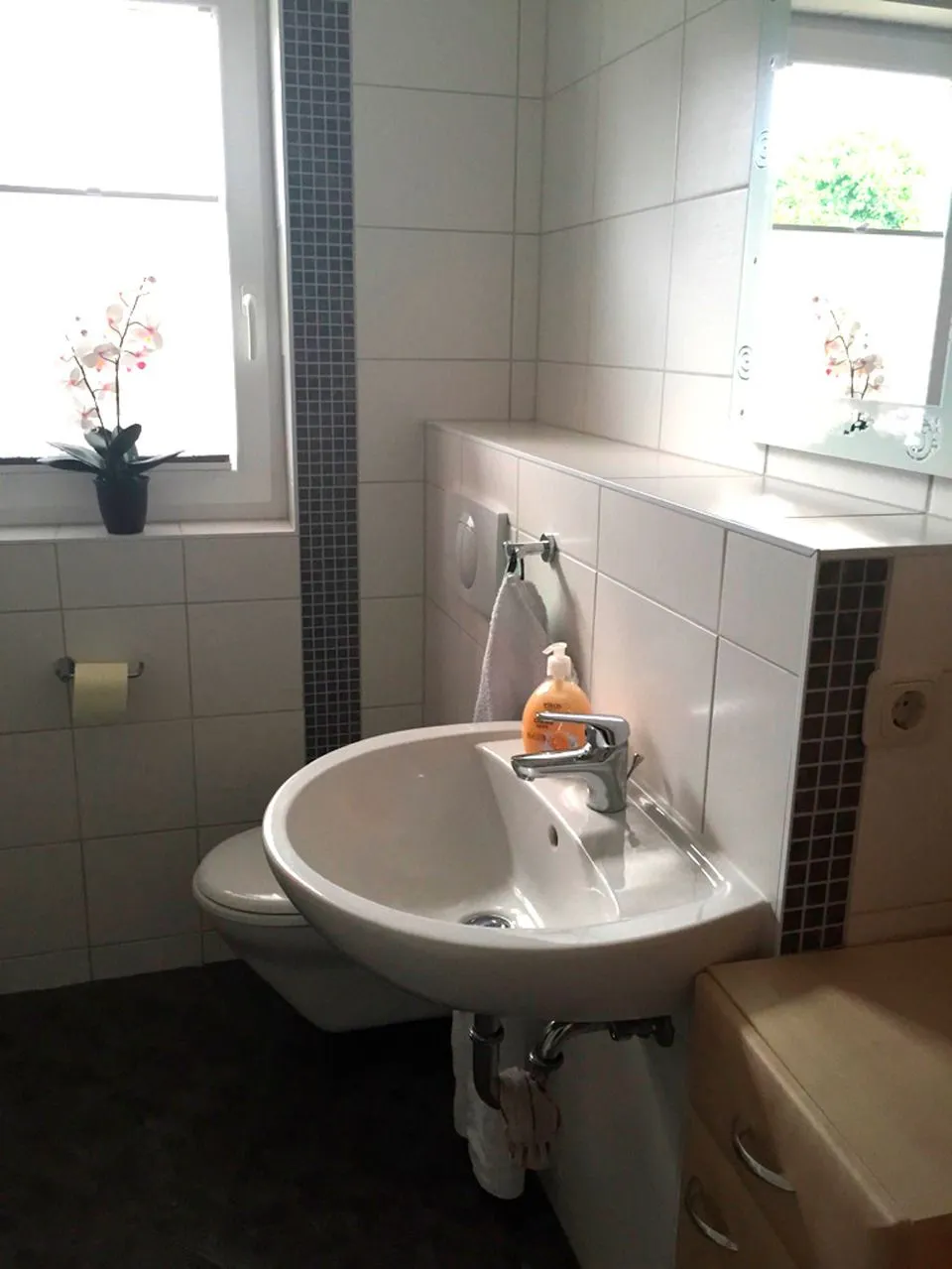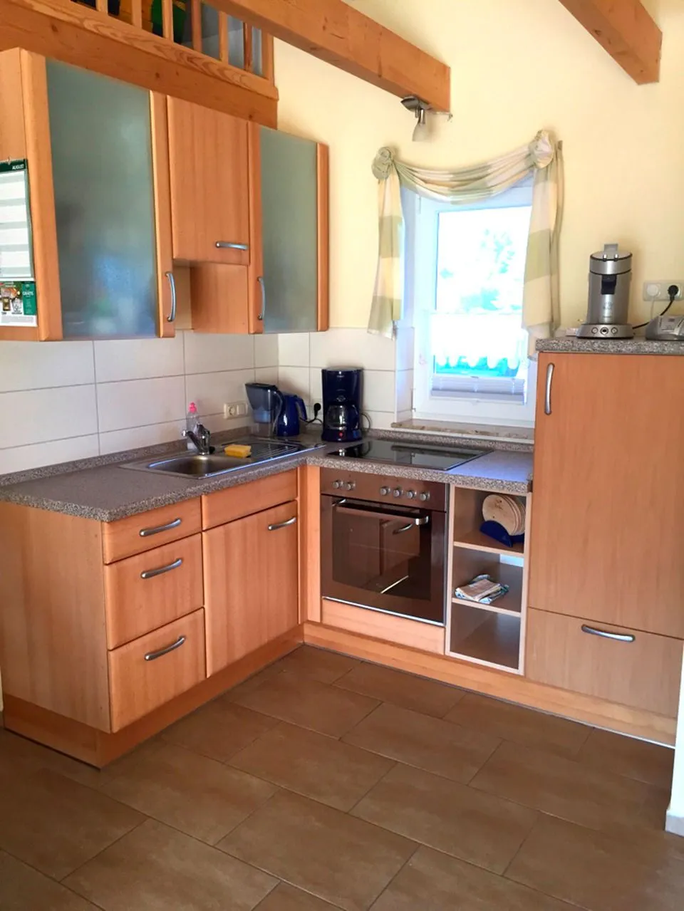 Im Wohnzimmer gibt es eine offene Küche, die mit einem Cerankochfeld, einem Backofen, einem Spülbecken, einem Kühlschrank mit Tiefkühlfach, einer Kaffeemaschine, einem Toaster und einem Wasserkocher ausgestattet ist. Daneben steht ein Esstisch mit Stühlen. Im Wohnbereich finden Sie eine Couch, einen Schrank und einen Fernseher. Im Bad sind eine Dusche, ein WC, ein Waschbecken, ein Spiegel und ein Schrank. Das Schlafzimmer ist eingerichtet mit einem Doppelbett und einem Kleiderschrank. Im Dachgeschoss erreichen Sie über eine schmale steile Treppe eine offene Galerie, in der ein zusätzliches Doppelbett (2,20 m x 1,80 m) steht. Die Fenster des Hauses sind mit Allergiker/Pollengitter ausgestattet. Am Haus gibt es eine Terrasse mit Gartenmöbeln.