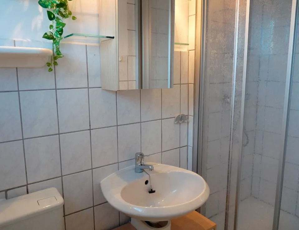 Das Badezimmer ist ausgestattet mit einer Dusche, dem WC, einem Waschbecken und einem Spiegelschrank.