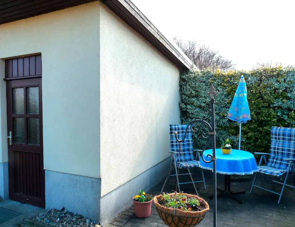 Am Haus ist Ihre Terrasse, auf der Sie gerne Frühstücken können. Gartenmöbel, ein Sonnenschirm und ein Holzkohlegrill stehen Ihnen zur Verfügung.