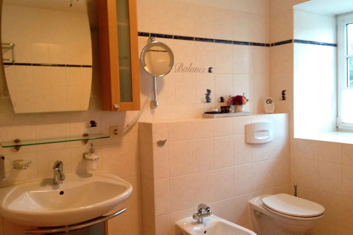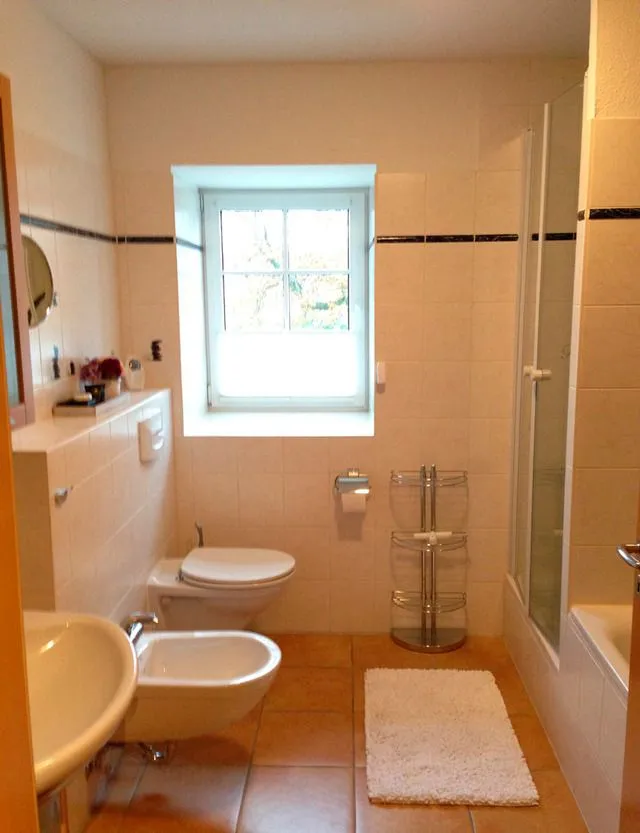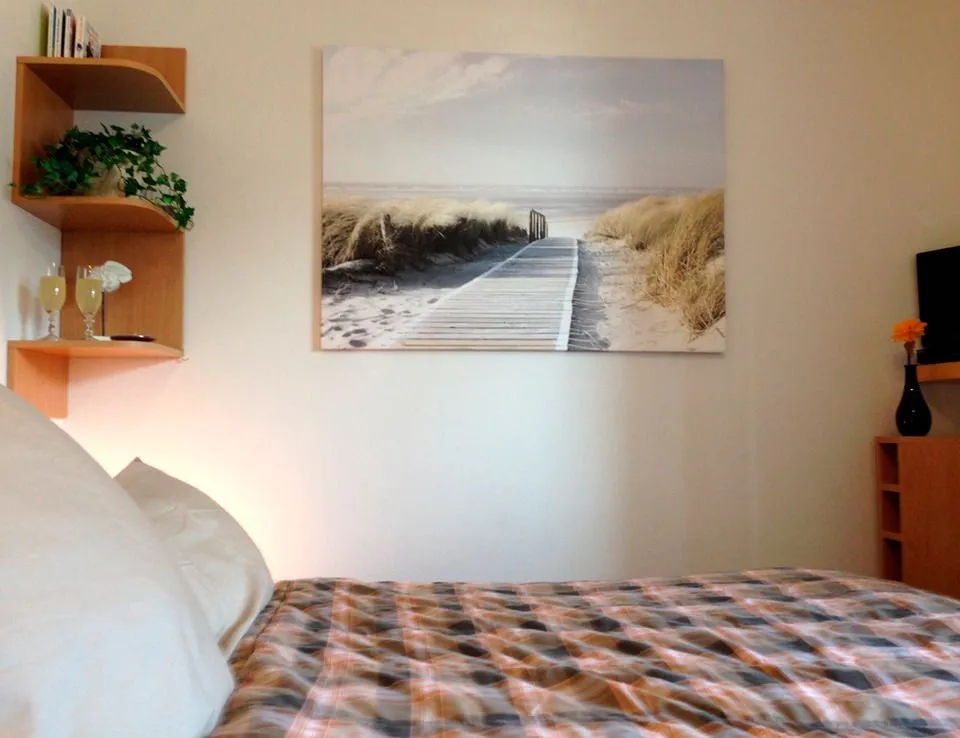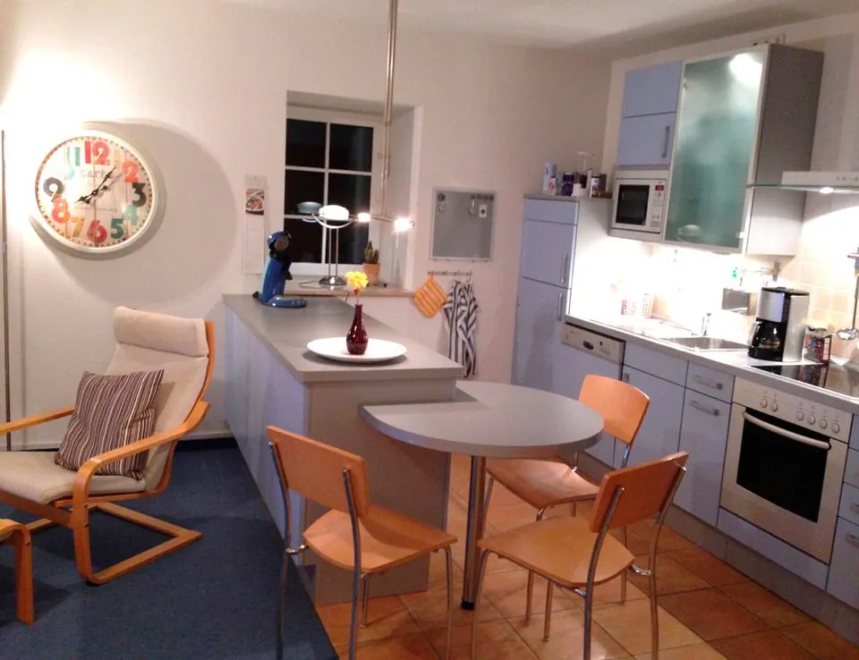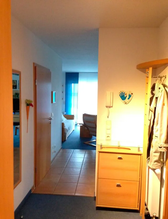 Sie betreten die Wohnung im Flur mit Flurgarderobe, Spiegel und Schuhschrank. Im Wohnzimmer finden Sie eine ausklappbare Schlafcouch, als Aufbettung für eine Person, einen Couchtisch, einen Sessel, zwei Wohnwände, ein Sideboard und den Flachbildfernseher mit integrierten Radiosendern. Vom Wohnzimmer aus gelangen Sie auf Ihren Süd-Balkon mit Gartenmöbeln. Die offene Küche ist komplett ausgestattet mit einem Backofen, einem Cerankochfeld, einem Geschirrspüler, einem Kühlschrank mit Tiefkühlfach, einer Mikrowelle, einer Filter- und Senseokaffeemaschine, einem Wasserkocher und einem Toaster. An die Küchenzeile ist ein Esstisch mit 3 Stühlen intregriert. Das Schlafzimmer ist eingerichtet mit einem Doppelbett, einem zweiten kleineren Fernsehgerät, einem Radiowecker und einem Kleiderschrank. Im großen hellen Badezimmer gibt es eine Dusche, eine Badewanne, das WC, ein Bidet, einen Waschtisch und einem beleuchtbaren Kosmetikspiegel. Badezimmer und Küche haben eine Fußbodenheizung. Im Schlafzimmer und an der Terassentür im Wonzimmer sind Fliegengitter angebracht.
