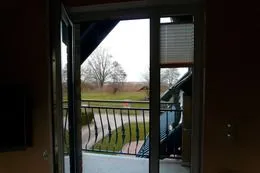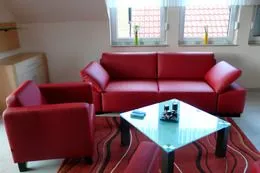 Sie betreten diese liebevoll eingerichtete Ferienhaushälfte über einen Flur. Von hier erreichen Sie die beiden Schlafzimmer und in das Bad mit Dusche und WC. Ein Schlafzimmer ist mit einem Doppelbett und einem Kleiderschrank möbliert. Das zweite Schlafzimmer hat zwei Einzelbetten, einen Kleiderschrank und einen Stuhl. Zusätzlich gibt es einen Abstellraum mit Staubsauger und Reinigungsgeräten. Über die Treppe im Flur gelangen Sie in den Wohnbereich des Dachgeschoßes. Darin befinden sich eine Couch, zwei Sessel, ein kleiner Tisch und ein 80 cm Flachbildfernseher. Vor der offenen Küche steht ein Esstisch mit Stühlen. Die Küche ist mit einem Ceranfeldherd mit Backofen, Kühlschrank mit Gefrierfach, Mikrowelle, Geschirrspüler, Wasserkocher, Kaffeemaschine und Toaster ausgestattet. Auf dieser Etage befindet sich zusätzlich ein Gäste - WC. Im gesamten Haus gibt es eine Fußbodenheizung. Vom Wohnzimmer aus kommen Sie auf den kleinen Balkon mit Seeblick und einen großen Balkon. Beide Balkone sind mit Gartenmöbeln versehen. Ein Grill steht Ihnen zur Verfügung.