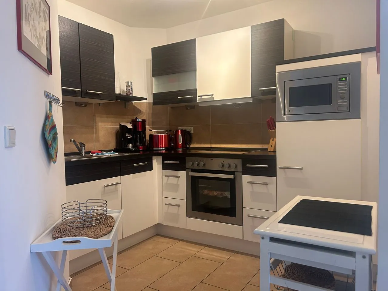 Vom Herd mit Cerankochfeld und Umluft-Backofen über den Geschirrspüler, einer Kaffeemaschine, einem Kühlschrank mit Gefrierfach und einer Padmaschine bis hin zu ausreichend Besteck und Geschirr finden Sie alles, um Ihre Mahlzeiten perfekt zubereiten zu können.