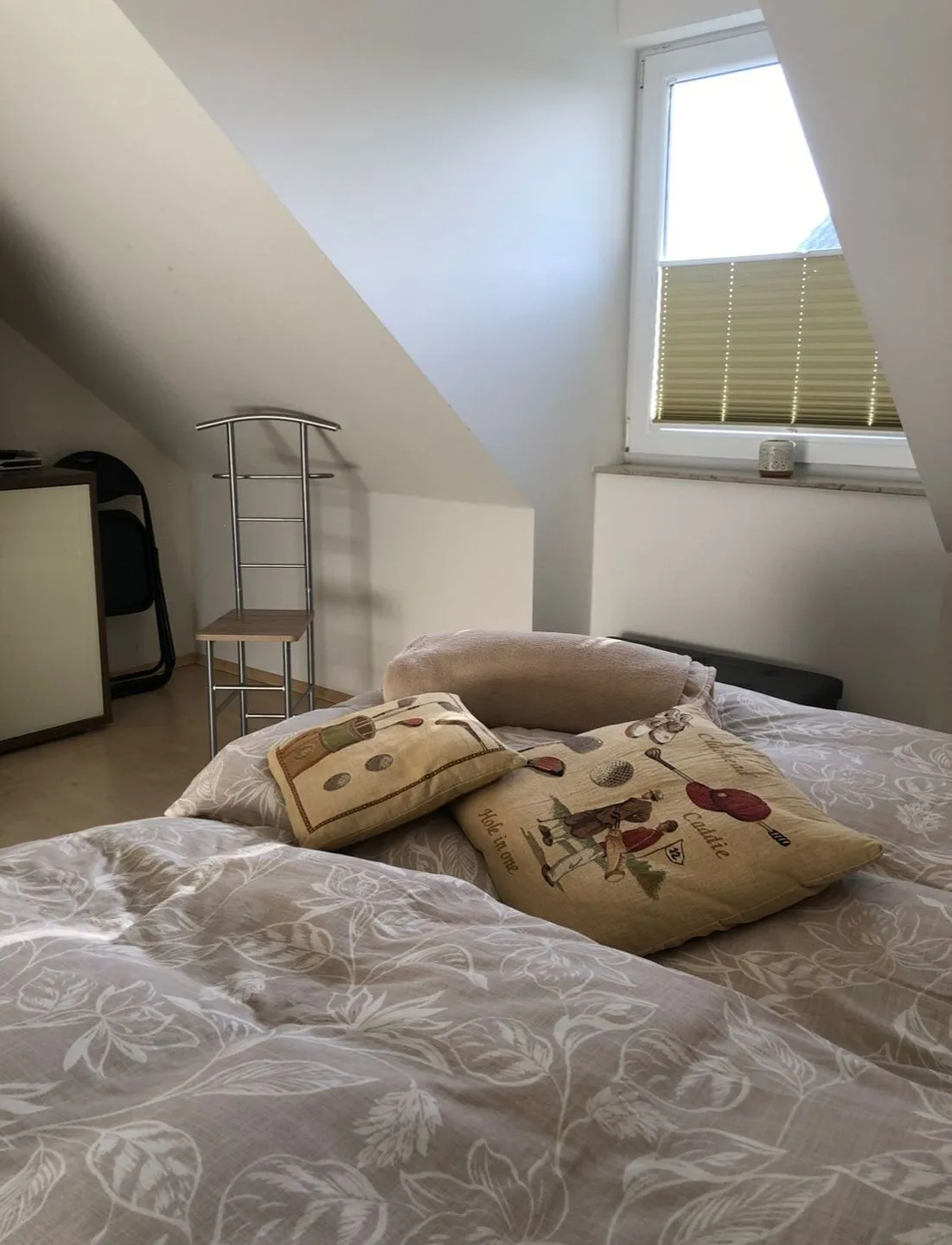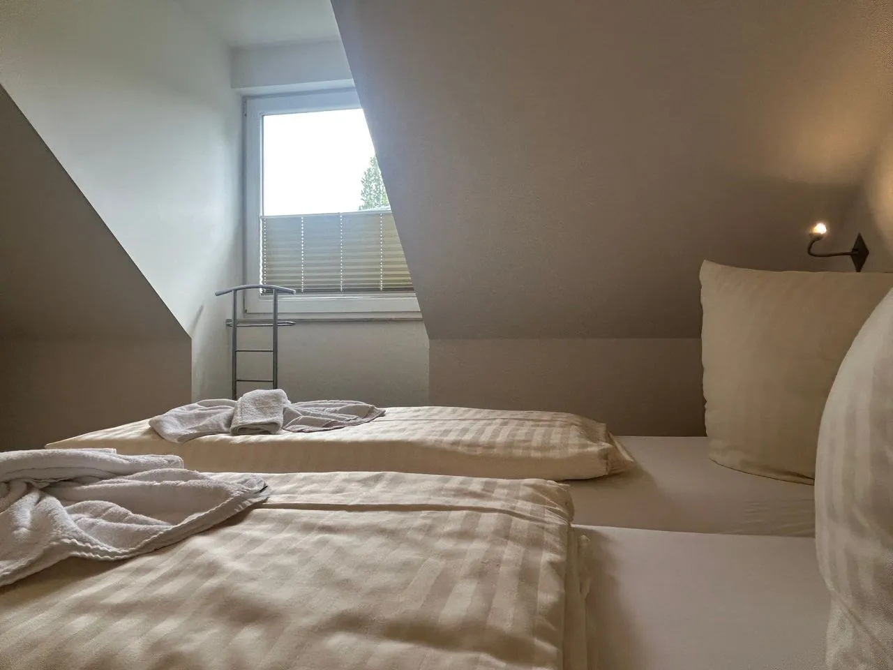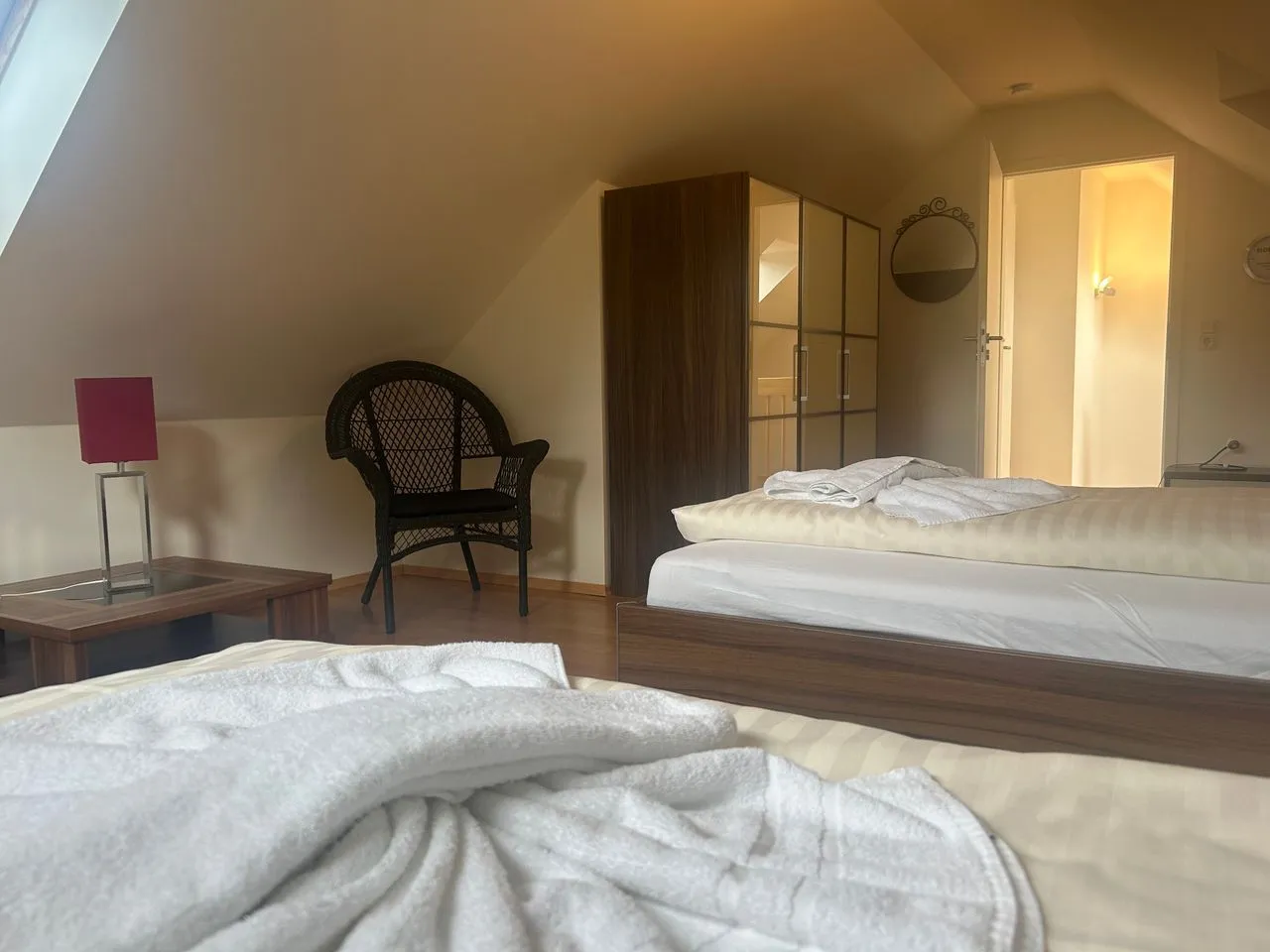 Das Schlafzimmer im Dachgeschoss ist mit 3 Einzelbetten ausgestattet, bei Bedarf können zwei davon auch zusammengestellt werden. Drei Nachttische, ein geräumiger Kleiderschrank, ein Sessel und ein Tisch sowie ein Beistellregal mit TV komplettieren die Einrichtung.