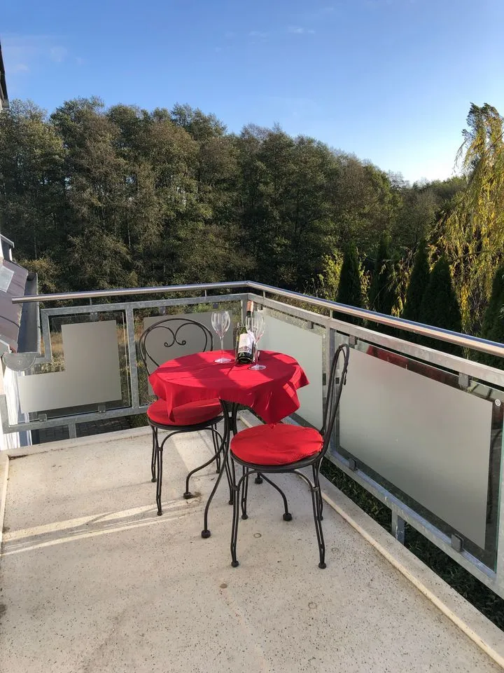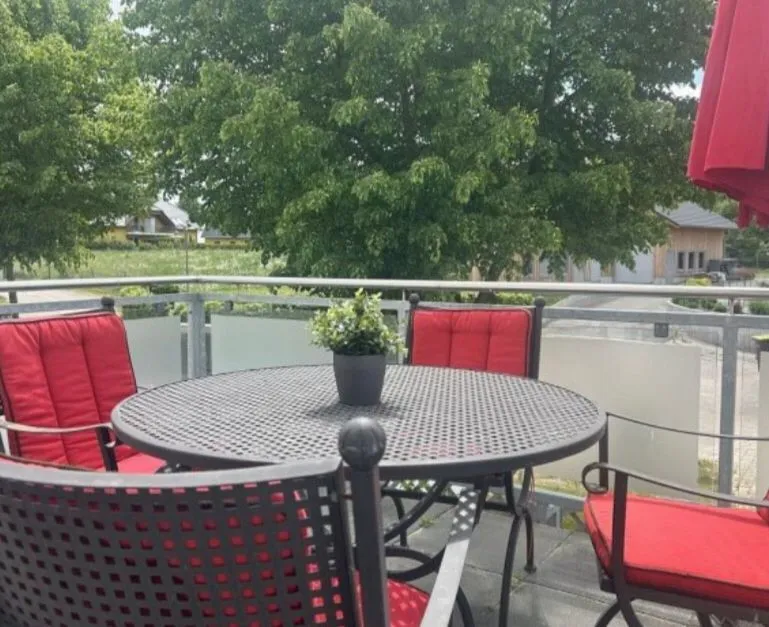Ebenso lädt ein großzügiger Balkon, ausgestattet mit einem Tisch und 4 Stühlen sowie einem Sonnenschirm zum Verweilen ein.