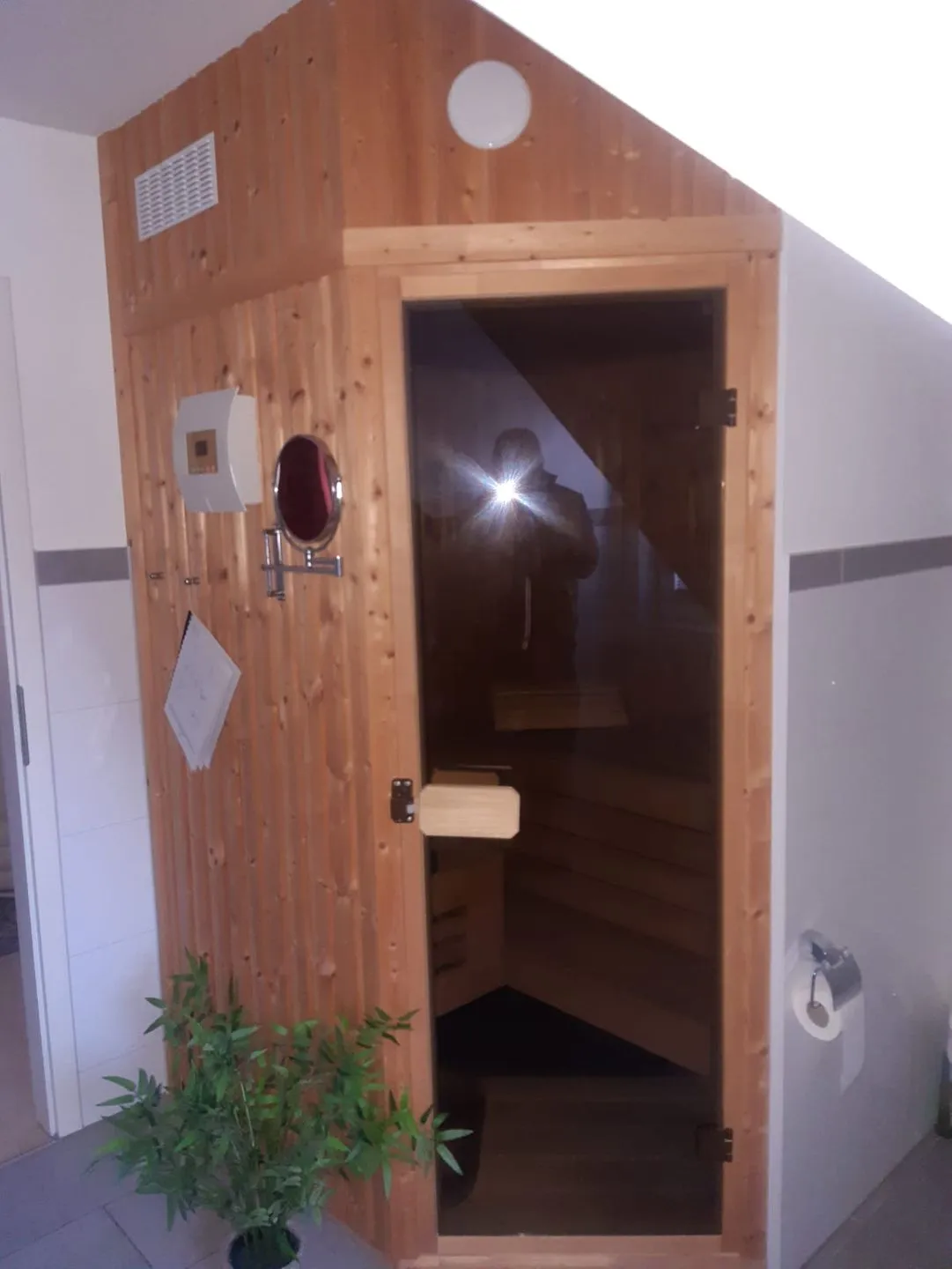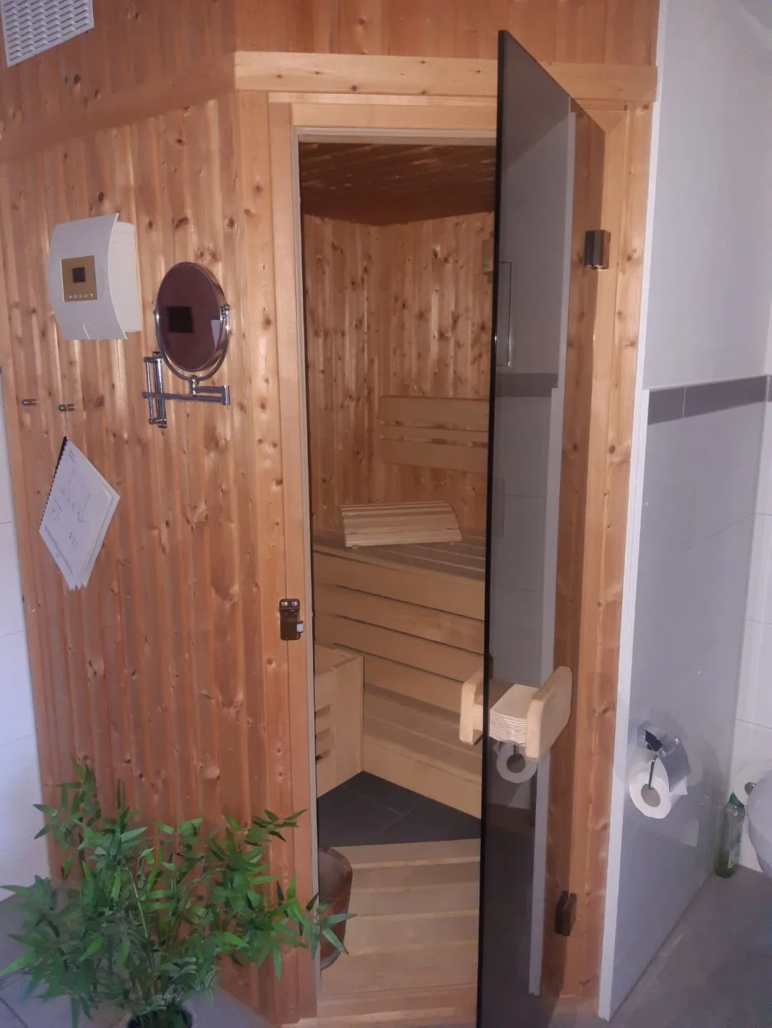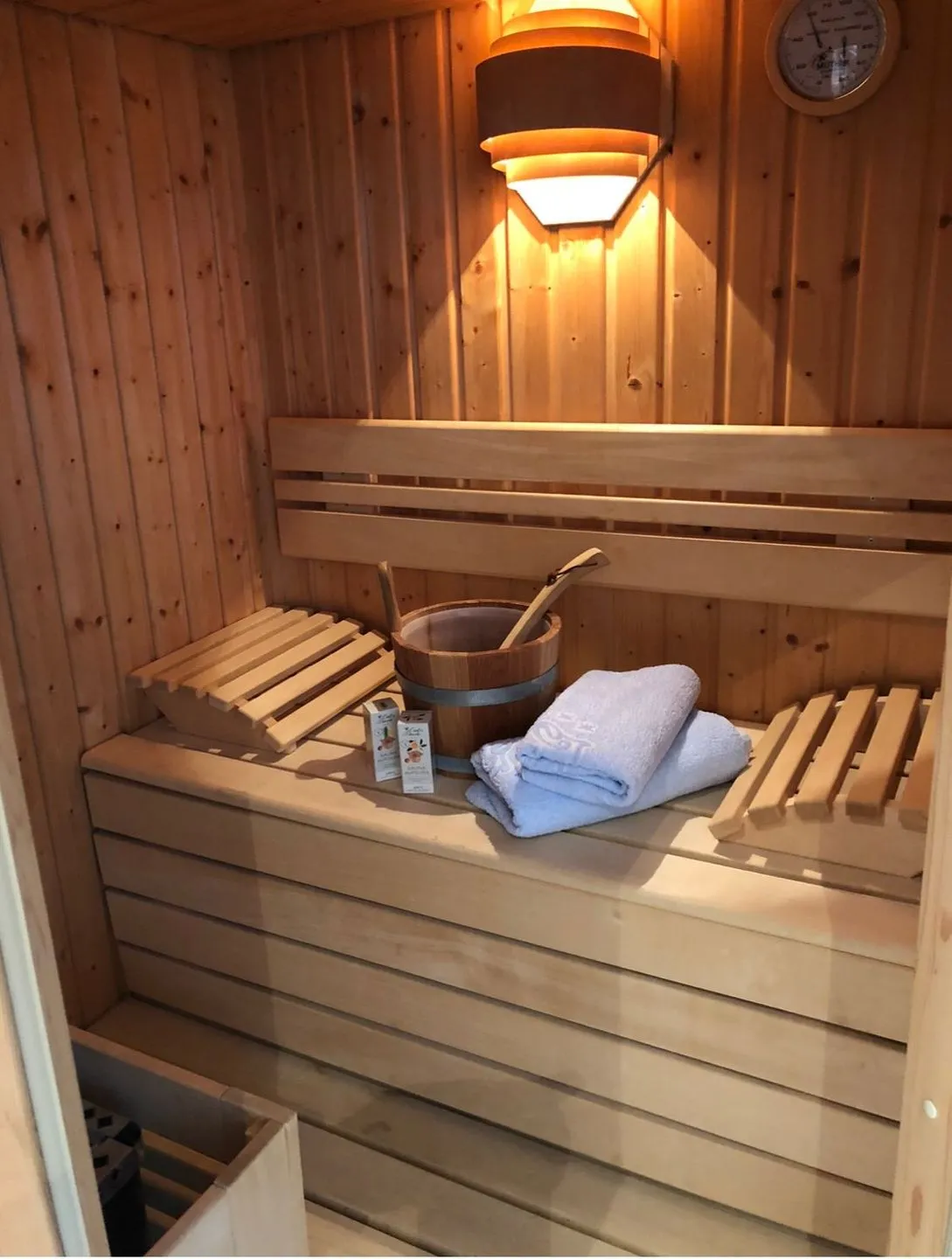 Das Badezimmer ist ausgestattet mit einer gemütlichen Sauna, einer ebenerdigen Dusche, einem großzügigen Waschtisch, einem Schminkspiegel und einem Handtuchtrockner.