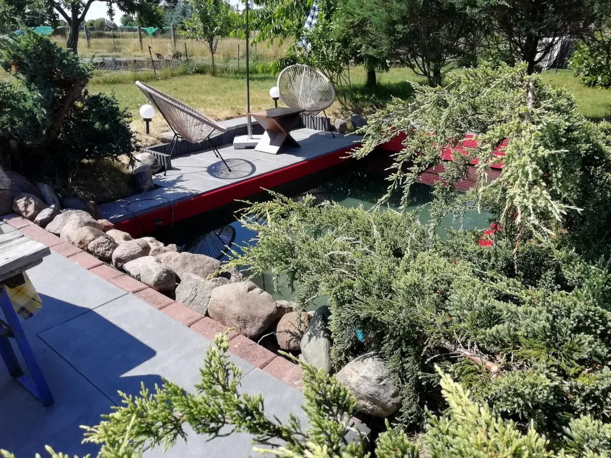 Die Küche hat eine Tür zur lichtdurchfluteten Terrasse im Garten – gesäumt von Blumenrabatte und Goldfischteich. Sonnenschirm, Tisch und 4 Stühle stehen zur Verfügung. Hinter dem Haus in der Wiese gibt es einen Grillplatz mit Erfrischungsbassin, 90 cm tief, und Fontaine. Das Becken wird regelmäßig gereinigt. An heißen Sommertagen hopsen Sie einfach ins kalte Wasser oder lassen die Beine hinein baumeln. Es gibt übrigens auch eine Gartendusche. Im Schuppen steht eine Tischtennisplatte, die benutzt werden darf. Kellen und Bälle sind vorhanden. Ihren PKW können Sie auf dem Grundstück parken.