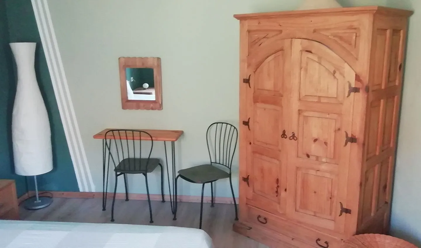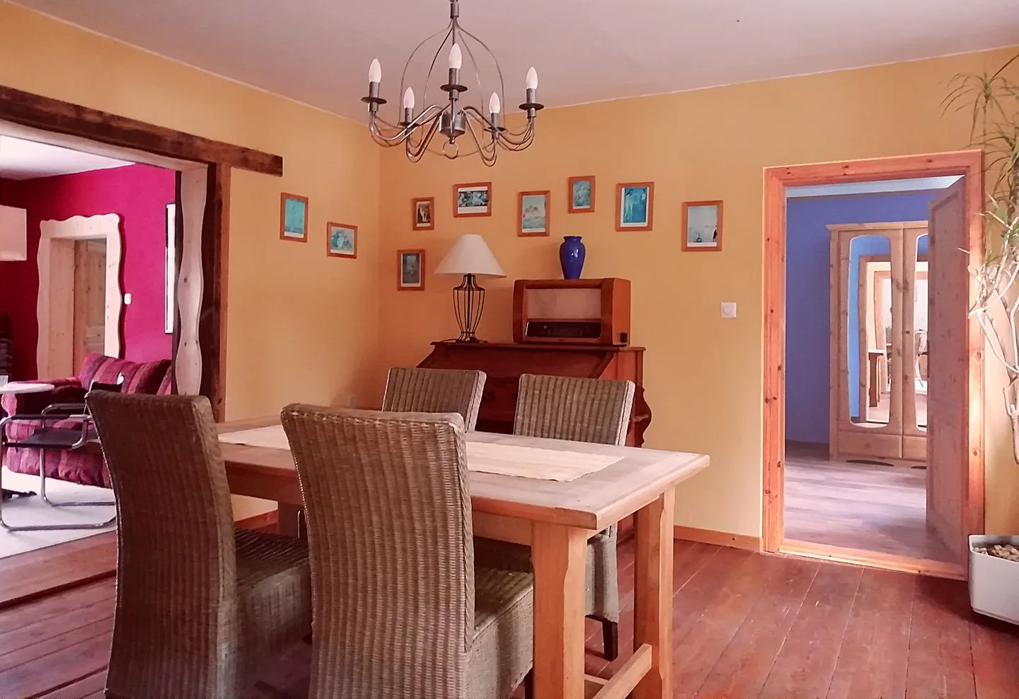 An die Küche grenzt eine kleine Kammer. Dort finden Sie Sportgeräte wie Beach-Ball, Badminton, Boulekugeln und diverse Gesellschaftsspiele für den Abend oder kalte Tage. Auch eine Waschmaschine und eine kleine Kühltruhe befinden sich dort. Das Esszimmer liegt neben der Küche. Am gediegenen Eichentisch mit 6 Stühlen lässt es sich gut dinieren oder spielen. Außerdem gibt es ein altes Harmonium, an dem talentierte für ein wenig musikalische Unterhaltung sorgen können. Genießen Sie Ihr Frühstück wenn morgens die Morgensonne ins Fenster des Esszimmers strahlt. Der Raum öffnet sich mittels eines breiten Durchgangs zum Wohnzimmer hin. Hier stehen eine Couch und 2 Sessel. Eine Stereoanlage, DVD Player, diverse Filme, Musik-CDs und Bücher und ein digitaler Satelliten TV ergänzen das Freizeitangebot. Am Abend durchflutet die Abendsonne mit Ihrem warmen Licht dieses Zimmer. Für die kalte Jahreszeit gibt es einen Kaminofen..
