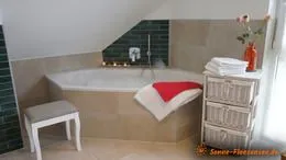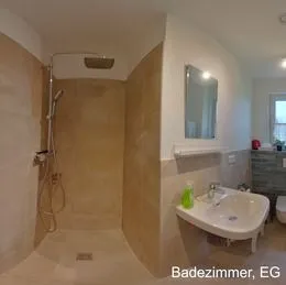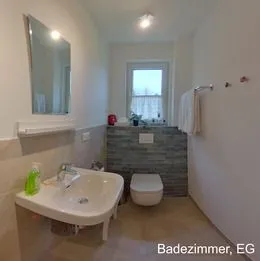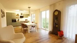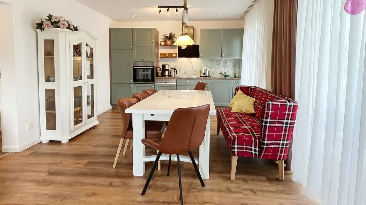 Die große Wohnküche ist mit einem Ceranfeldherd, Backofen, Mikrowelle, Kühlschrank und einem großen Esstisch mit einem gemütlichen Küchensofa, sowie 6 Stühlen ausgestattet. Das Haus verfügt über zwei Bäder mit Dusche, eines davon zusätzlich mit einer großen Badewanne.