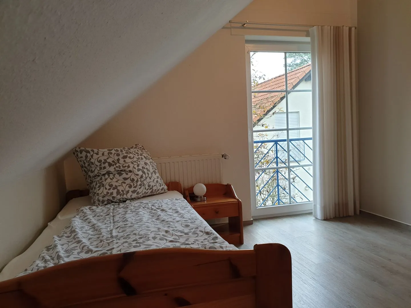 Schlafzimmer befinden sich 2 Einzelbetten, 1 Kleiderschrank sowie 1 Tisch mit Stühlen.