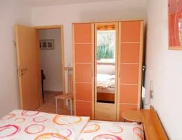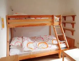 Ein Schlafzimmer verfügt über einen Kleiderschrank sowie ein klassisches Doppelbett, im zweiten Schlafzimmer befinden sich ein Kleiderschrank und ein Etagenbett für drei Personen, die untere Liegefläche bietet Platz für zwei Personen (1,40 m breit). Somit ist das Haus besonders für Familien mit bis zu drei Kindern geeignet.