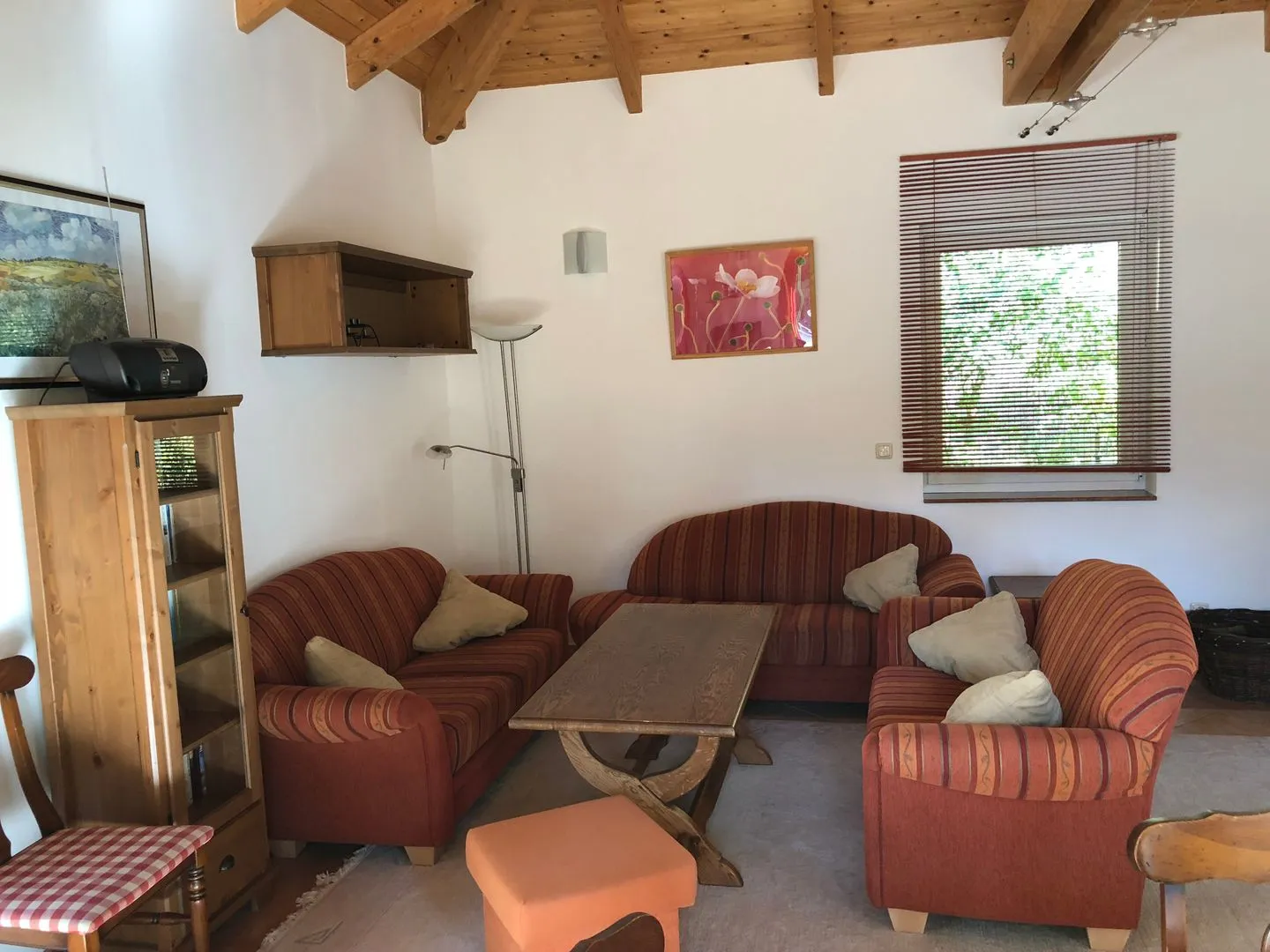 Unser gemütliches Ferienhaus bietet mit zwei separaten Schlafzimmern Schlafgelegenheiten für insgesamt 5 Personen. Im großzügigen Wohnzimmer mit Holzbalkendecke und offener Küche befinden sich eine Sitzgruppe mit zwei Sofas und einer Récamière, ein großer Esstisch, ein Kaminofen sowie ein TV-Gerät, eine Stereoanlage und ein DVD-Player.