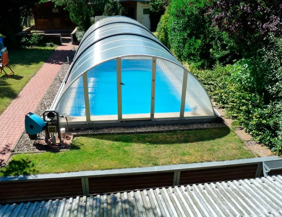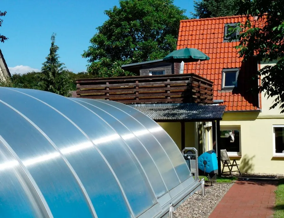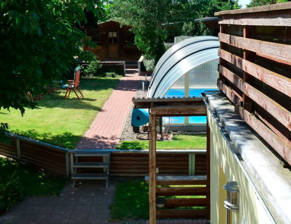 Im Garten gibt es einenen Pool, sowie ein separates Haus mit einer Sauna. Gerne können Sie beides nutzen, wobei die Sauna dann für Ihre gesamte Urlaubszeit gebucht werden müsste.