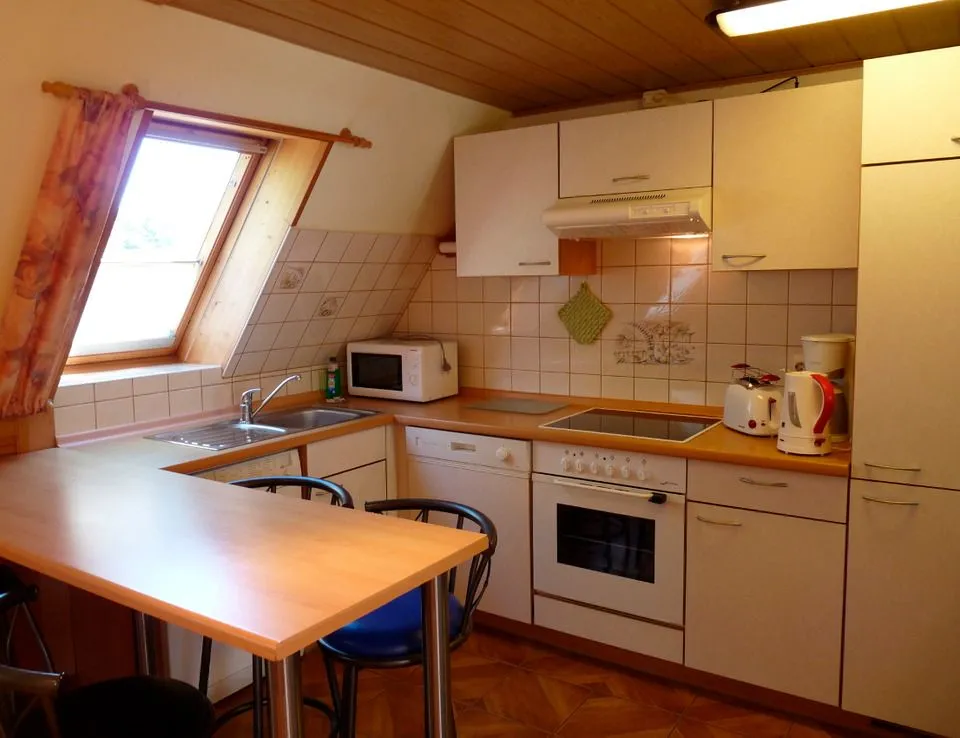 Das Wohnzimmer hat eine offene Küche, die mit einem Backofen und 4 Kochplatten, einer Mikrowelle, einem Geschirrspüler, einem Kühlschrank mit Tiefkühlfach, einer Kaffeemaschine, einem Wasserkocher, einem Toaster und einer Waschmaschine ausgestattet ist. Ein Tresen als Esstisch grenzt die Küche vom Wohnbereich ab. Das Wohnzimmer ist eingerichtet mit zwei Couchen, einem kleinen Tisch und dem Fernseher.