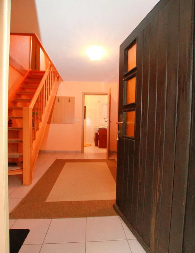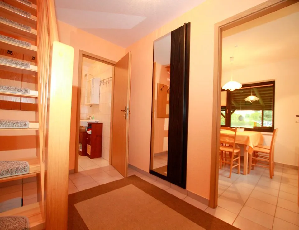 Das 75 m² große Ferienhaus ist gepflegt und ordentlich eingerichtet. Über den Flur mit Garderobe gelangen Sie in den Wohnbereich. Hier finden Sie eine Couch, zwei Sessel, einen Clubtisch, eine Anbauwand und das TV-Gerät. Die Küche ist mit einem Ceranfeldherd mit Backofen, einem Geschirrspüler, einer Kaffeemaschine, einem Toaster, einem Wasserkocher, einem Radio, einem Esstisch mit 6 Stühle und einem Kühlschrank mit Tiefkühlfach ausgestattet. Das Badezimmer hat eine Dusche und verfügt über eine Fußbodenheizung. Über eine Treppe gelangen Sie ins Obergeschoss mit den beiden Schlafzimmern. Das erste Schlafzimmer ist mit einem Doppelbett, einem Sessel und einem Kleiderschrank möbliert. Das zweite Schlafzimmer verfügt über zwei Einzelbetten und einem Kleiderschrank. Zum Haus gehört eine überdachte Terrasse mit Gartenmöbel und einem Grill. Hier können Sie mit einem guten Frühstück in den Tag starten oder die Abende gemütlich ausklingen lassen. Ein Parkplatz befindet sich gleich neben dem Ferienhaus unter dem Carport. Die Liegewiese im Garten, bietet Ihnen im Sommer ideale Möglichkeiten zum Sonnenbaden.