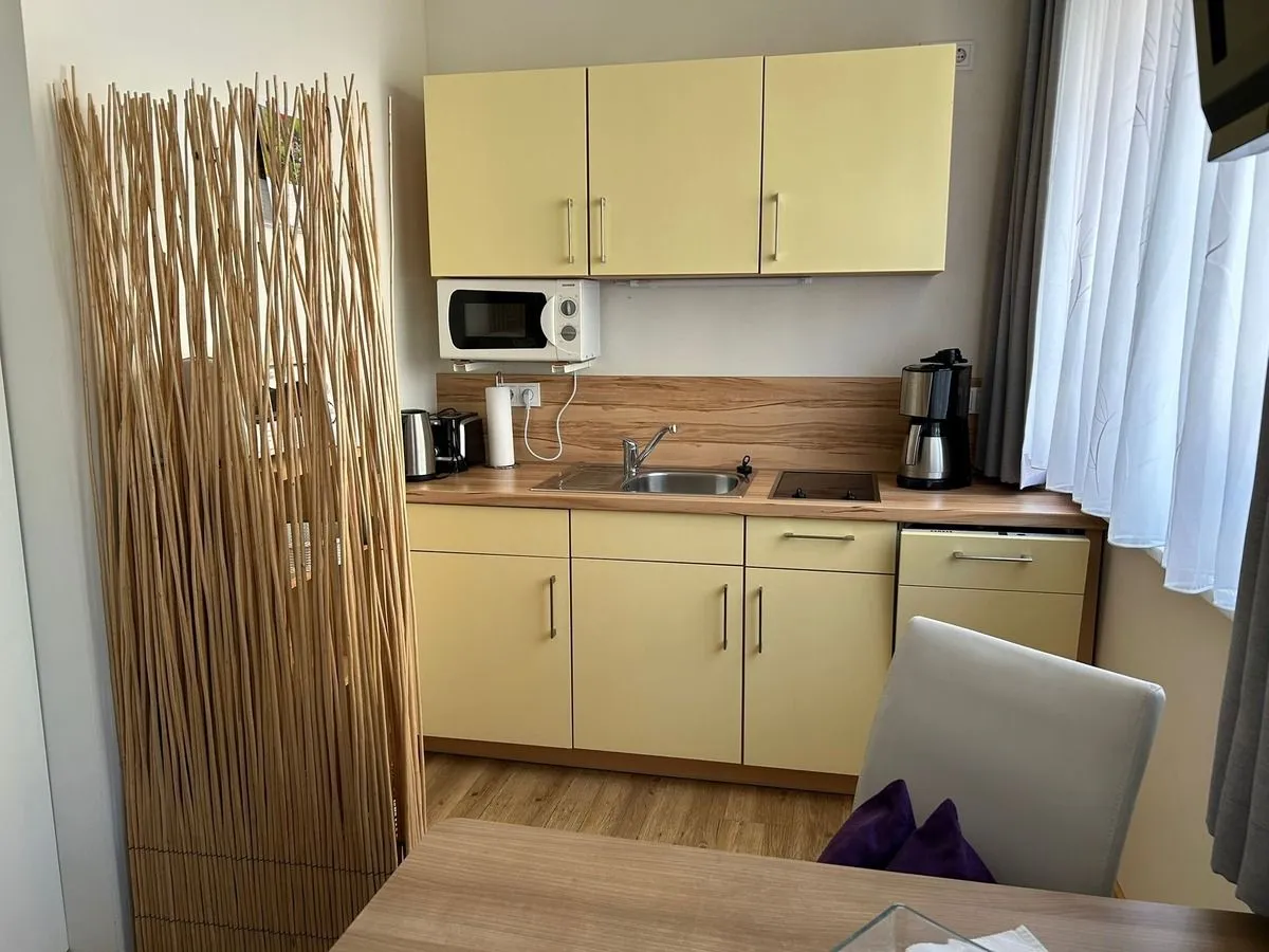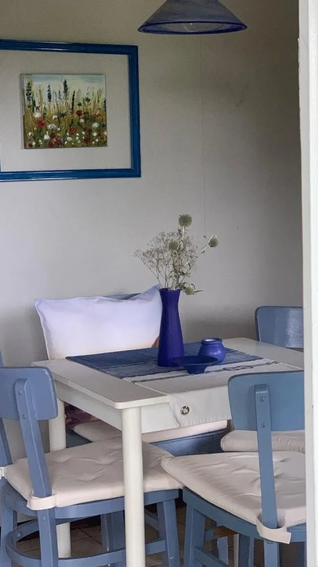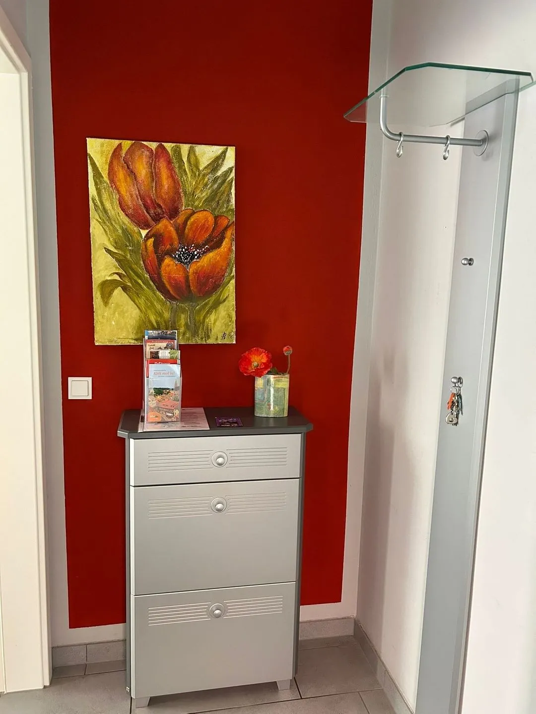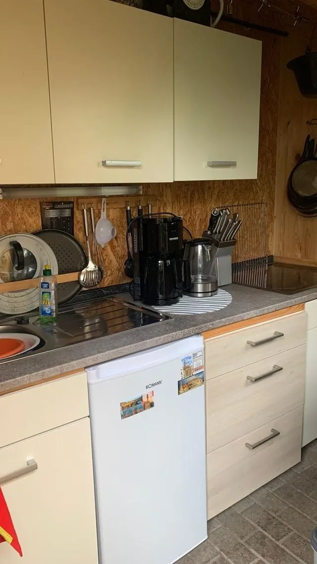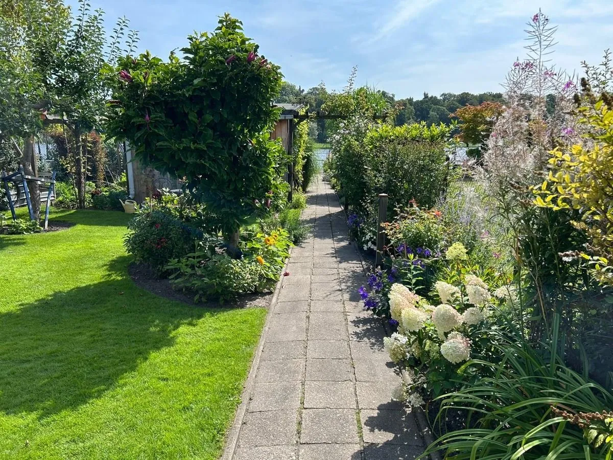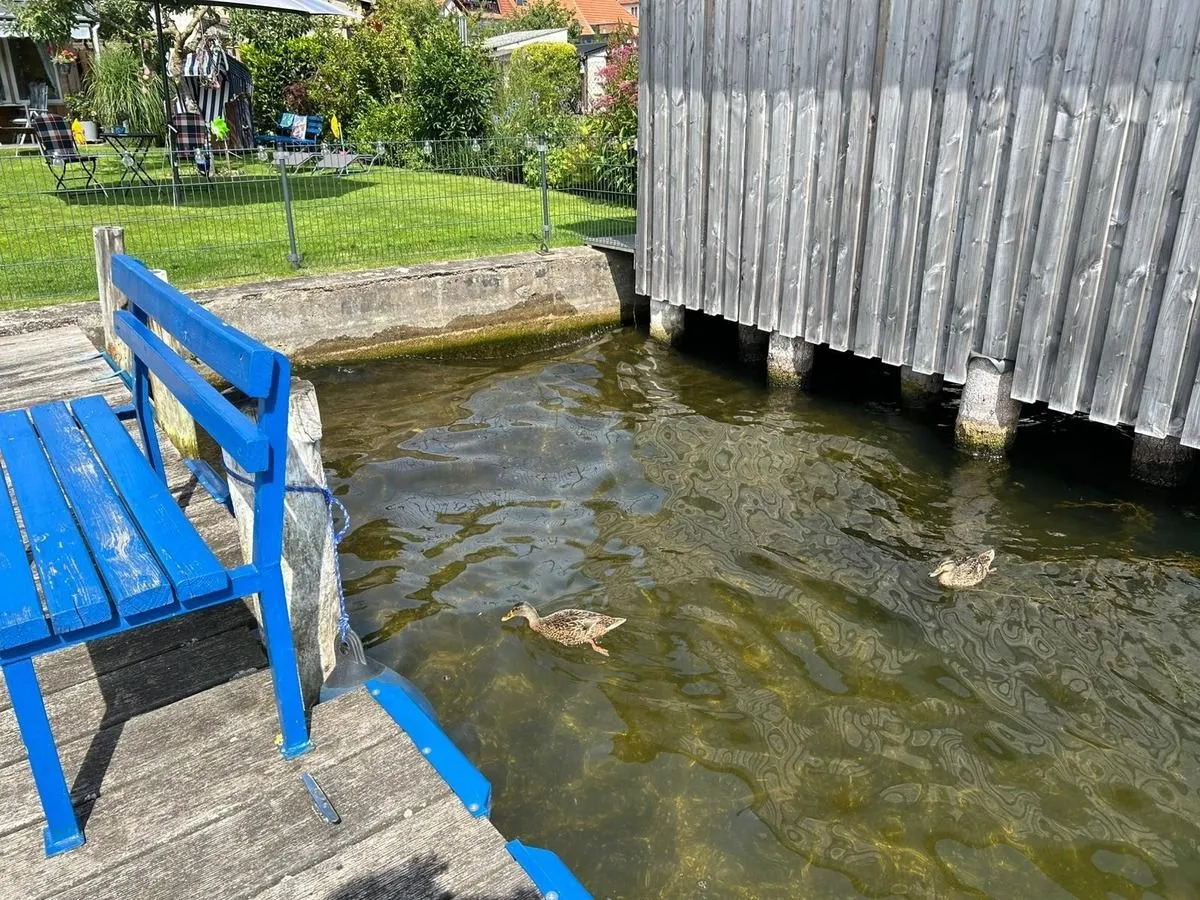 Die Ferienwohnung betreten Sie über nur eine Stufe im Erdgeschoss des Hauses und dann ohne weitere Stufen und Schwellen. Die Wohnung hat einen eigenen separaten Eingang. Im Flur sind eine Flurgarderobe und ein großer Spiegel. Die kleine Ferienwohnung besteht aus einem Zimmer. Dieses ist ausgestattet mit einem Doppelbett, einem Kleiderschrank, einem Tisch mit Stühlen, zwei bequemen Lesesesseln, einem Fernseher und einer Küchennische. In der Küchenzeile finden Sie einen Kühlschrank mit Tiefkühlfach, zwei Cerankochflächen, ein Spülbecken, ein Geschirrspüler, eine Kaffeemaschine, einen Wasserkocher, einen Toaster und eine Mikrowelle. Im Bad gibt es eine ebenerdige Dusche mit Klappsitz, ein Waschbecken und das WC. Die gesamte Ferienwohnung wird mit Fußbodenheizung beheizt. Im Garten steht eine Gartenlaube mit Sitzmöbeln, in der Sie kühle Tage oder Abende mit einem Glas Wein verbringen können. Es gibt mehrere Sitzgelegenheiten und eine Terrasse mit Gartenmöbeln und Grill. Auch eine Lagerfeuerschale ist vorhanden. In einem Schuppen im Garten, finden Sie eine kleine urige Küche, in der Sie Ihren frisch gefangenen Fisch gern zubereiten können. Auf dem Grundstück finden Sie Platz für mitgebrachte Fahrräder und Kanus. Eigene Boote können auch am Steg festgemacht werden, hierbei muss jedoch die schwankende Wassertiefe vom 1 m bis 1,5 m beachtet werden. Ihren PKW können Sie in der Nähe des Hauses oder gegen Aufpreis auf dem Grundstück parken.