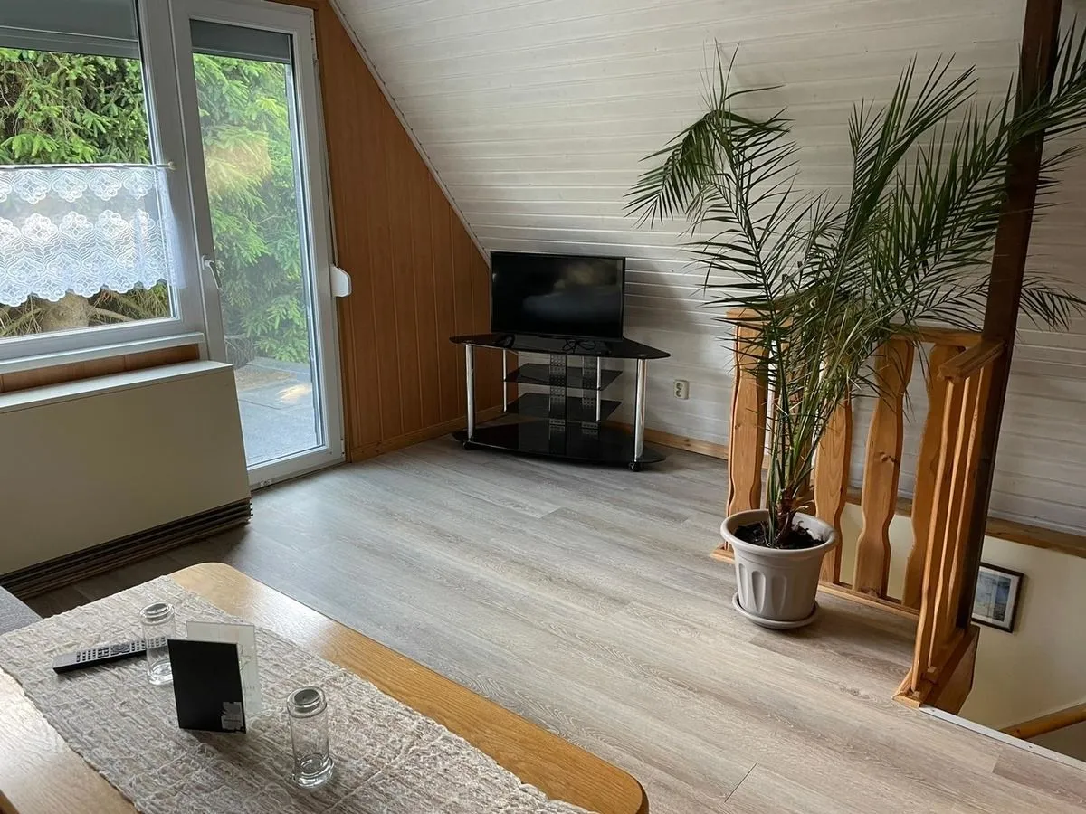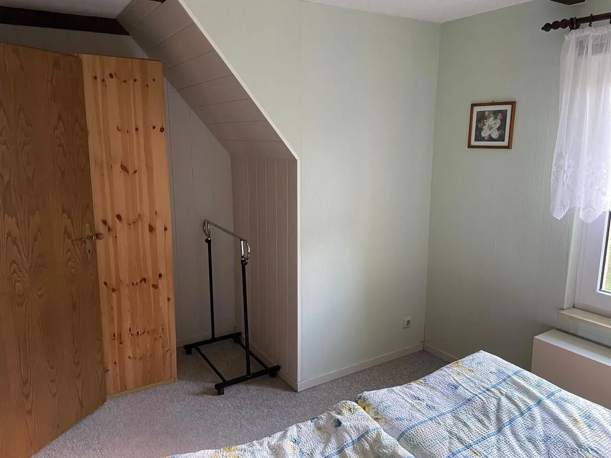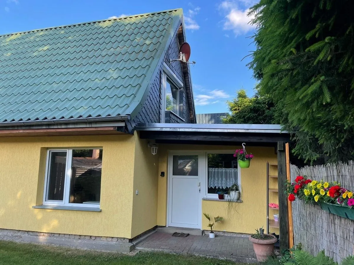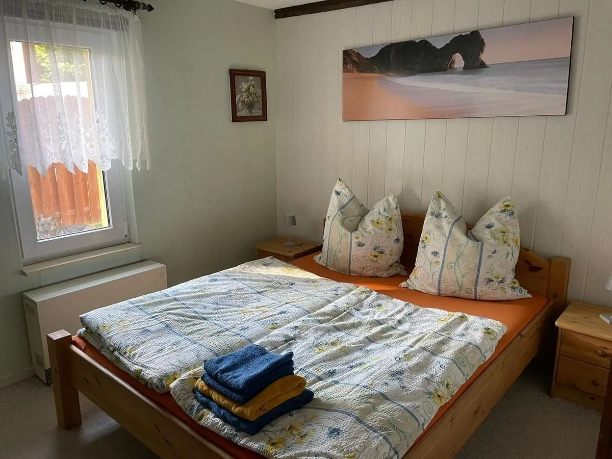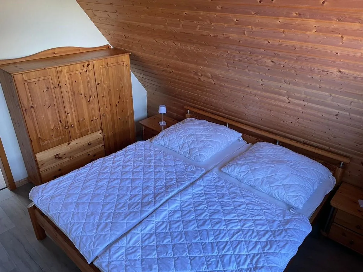 Sie betreten das Ferienhaus über die Veranda. Hier stehen Korbmöbel, ein Zweisitzer und zwei Stühle mit einem kleinen Tisch. Von hier aus gehen Sie in die Küche, die mit Schränken, einem Spülbecken, zwei Kochplatten, einer Mikrowelle, einem Kühlschrank mit Tiefkühlfach, Kaffeemaschine, Toaster und Wasserkocher eingerichtet ist. Des weiteren finden Sie hier ein Radio, einen Esstisch mit 4 Stühlen und einen Kinderhochstuhl. Über einen Flur mit Garderobe kommen Sie in ein Schlafzimmer und das Bad mit Dusche und WC. In der Küche befindet sich die Holztreppe nach oben. Im Dachgeschoss ist das zweite Schlafzimmer sowie das Wohnzimmer. Das Schlafzimmer unten, sowie das Schlafzimmer oben sind mit einem Doppelbett und Schränken ausgestattet. Das Wohnzimmer ist mit einer Eckcouchen, einem Sessel, einem kleinen Tisch und einer Kommode mit Fernseher möbliert. Im Garten ist eine Terrasse mit Gartenmöbeln, einem Grill und einem Sandkasten. Interessierte Kinder dürfen auch gern einen Blick in den Hühnerhof der Eigentümer riskieren. PKW-Parkplätze sind am Grundstück vorhanden.