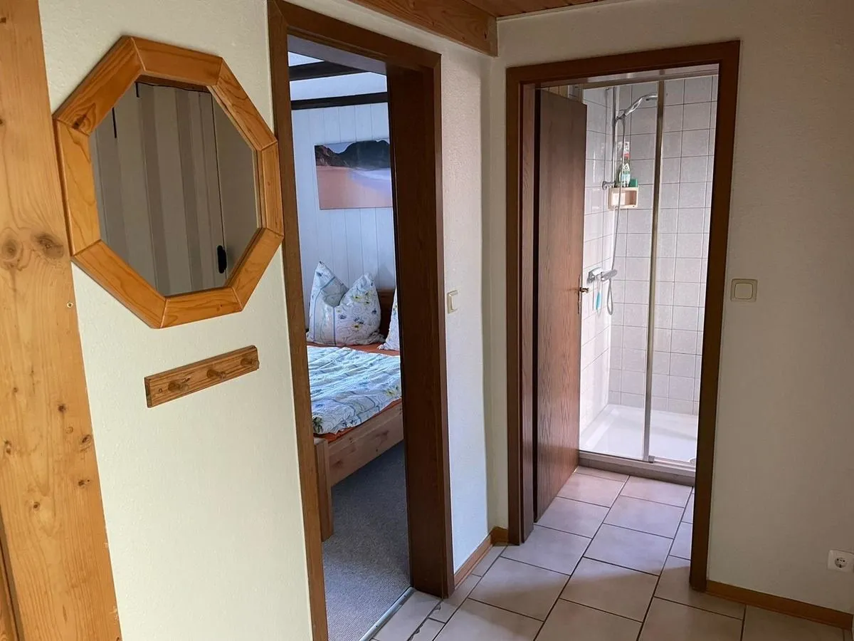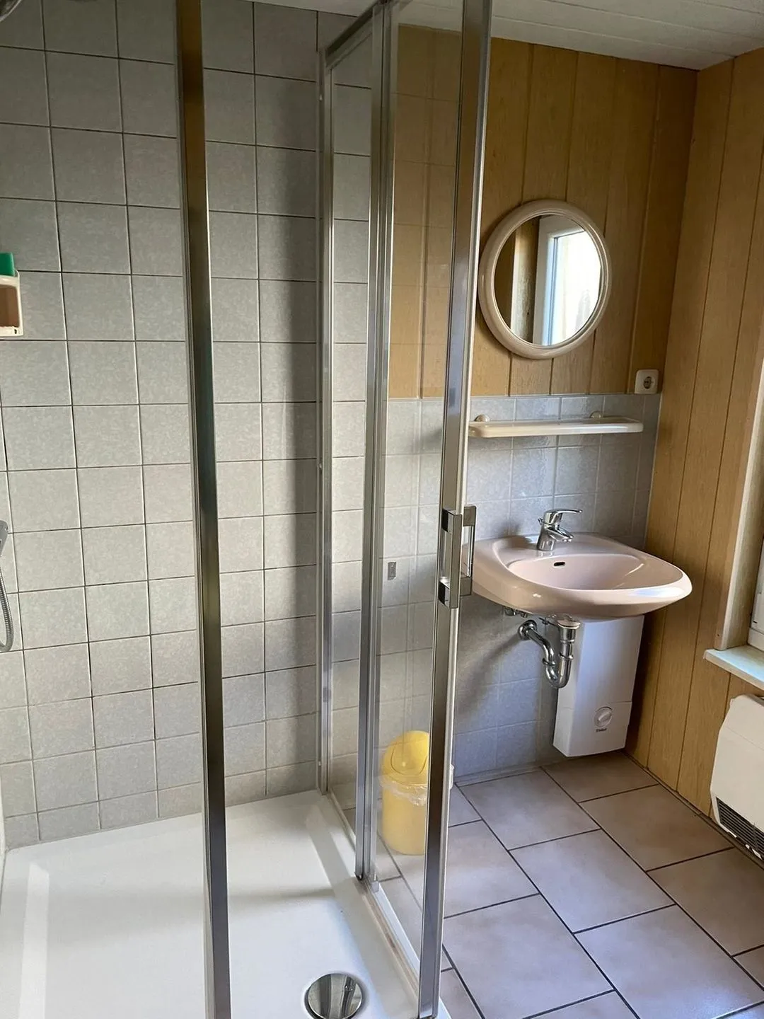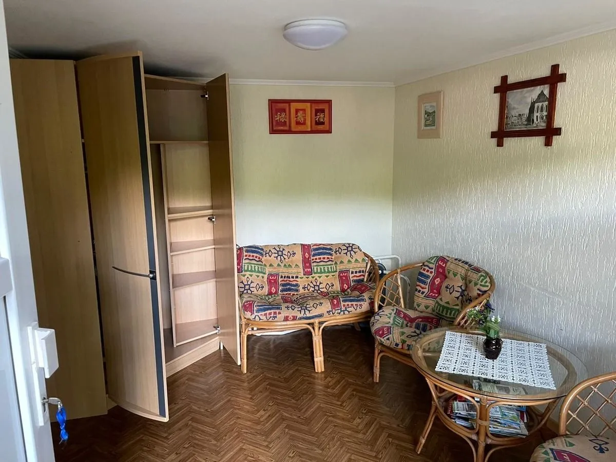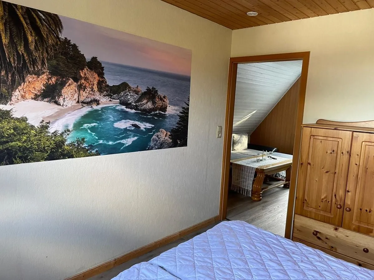 Sie betreten das Ferienhaus über die Veranda. Hier stehen Korbmöbel, ein Zweisitzer und zwei Stühle mit einem kleinen Tisch. Von hier aus gehen Sie in die Küche, die mit Schränken, einem Spülbecken, zwei Kochplatten, einer Mikrowelle, einem Kühlschrank mit Tiefkühlfach, Kaffeemaschine, Toaster und Wasserkocher eingerichtet ist. Des weiteren finden Sie hier ein Radio, einen Esstisch mit 4 Stühlen und einen Kinderhochstuhl. Über einen Flur mit Garderobe kommen Sie in ein Schlafzimmer und das Bad mit Dusche und WC. In der Küche befindet sich die Holztreppe nach oben. Im Dachgeschoss ist das zweite Schlafzimmer sowie das Wohnzimmer. Das Schlafzimmer unten, sowie das Schlafzimmer oben sind mit einem Doppelbett und Schränken ausgestattet. Das Wohnzimmer ist mit einer Eckcouchen, einem Sessel, einem kleinen Tisch und einer Kommode mit Fernseher möbliert. Im Garten ist eine Terrasse mit Gartenmöbeln, einem Grill und einem Sandkasten. Interessierte Kinder dürfen auch gern einen Blick in den Hühnerhof der Eigentümer riskieren. PKW-Parkplätze sind am Grundstück vorhanden.