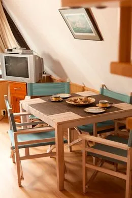 Im Inneren des Ferienhauses sorgt eine moderne Elektroheizung für wohlige Wärme, auch an kühleren Tagen. Die offene Kochnische ist praktisch eingerichtet und bietet einen 2-Platten-Herd, Kühlschrank, Toaster, Wasserkocher sowie sämtliche Küchenutensilien, Geschirr und Besteck. Im Essbereich steht Ihnen ein Esstisch zur Verfügung, sodass Sie Ihre Mahlzeiten entspannt im Haus genießen können. Ein Sofa und ein TV im Wohnzimmer liefern Komfort für gemütliche Stunden. Das Badezimmer ist mit Dusche, Waschbecken, WC und Spiegel ausgestattet; warmes Wasser gehört selbstverständlich zur Ausstattung.