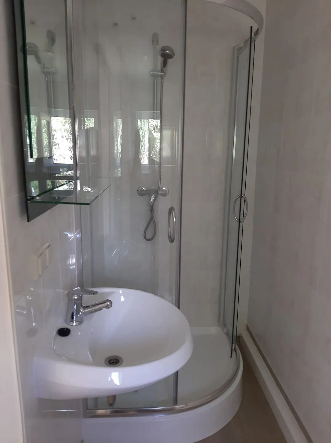 Sie betreten die kleine Ferienwohnung, im separaten Anbau, mit eigenem Eingang, gleich im Wohnbereich mit kleiner Küche. Hier finden Sie eine Miniküche mit zwei Kochplatten, einem Spülbecken und Kühlschrank, Küchenschränke, Kaffeemaschine, Toaster und Wasserkocher. Desweiteren stehen hier ein flacher Schrank, ein Tisch, zwei Sessel, eine Stereoanlage und ein Fernseher. Im Schlafzimmer stehen ein Doppelbett, ein Kleiderschrank und ein Rattansessel. Das Bad ist mit einer Dusche, Waschbecken und dem WC ausgestattet. Vor der Tür ist Ihre Terrasse mit Gartenmöbel, Hollywoodschaukel und Grill. Ein PKW-Parkplatz ist auf dem Grundstück vorhanden. Mitgebrachte Fahrräder können Sie in die große Garage stellen.