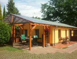Sie betreten das kleine Häuschen und gelangen direkt in die Küche. Diese ist mit Herdplatten, einer Kaffeemaschine, einem Toaster, einem Wasserkocher, einem Kühlschrank und einer Essecke für alle Personen eingerichtet. Weiterhin gibt es eine Flurgarderobe. Der Wohn- und Schlafbereich dieses Hauses ist mit einer Sitzgruppe, bestehend aus Schlafcouch und Sesseln sowie einem Doppelbett, einem Kleiderschrank, einem Siteboard und einem TV-Gerät eingerichtet. Das Bad hat eine Dusche. Am Haus steht Ihnen eine überdachte Terrasse mit Gartenmöbeln und Holzkohlegrill zur Verfügung. Ein PKW-Stellplatz ist vorhanden.