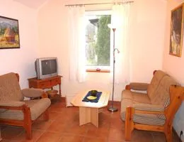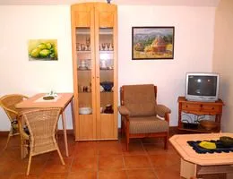 Das Ferienhaus an der Müritz in Waren ist liebevoll eingerichtet. Sie betreten es ebenerdig im Flur mit Flurgarderobe, Kleiderschrank und kleiner Sitzecke aus Korbmöbeln. Im Wohnzimmer mit offener Küche befinden sich eine Couch, ein Sessel, ein kleiner Tisch, eine Vitrine, ein TV-Schränkchen und ein Fernseher. In der kleinen Küchenzeile finden Sie einen Herd mit Backofen, einem kleinen extra Backofen zum Brötchen backen, eine Mikrowelle, eine Kaffeemaschine, einen Wasserkocher, eine Spüle, einen Kühlschrank mit Tiefkühlfach und einen Esstisch mit Stühlen. Das geräumige Bad hat eine Dusche, das WC, einen Hocker und ein Waschbecken. Das Schlafzimmer ist mit zwei einzelnen aber zusammen stehenden Betten, zwei Nachtschränken, einem Stuhl und einem Garderobenständer möbliert. Zum Ferienhaus gehört eine kleine überdachte Terrasse mit Korbmöbeln. Zwei Liegen stehen Ihnen auf der dazugehörenden Liegewiese zur Verfügung. Alle Bilder im Ferienhaus sind von der Vermieterin selbst gemalt. Gern dürfen Sie auch die Galeriewerkstatt auf dem Grundstück besichtigen. Ein PKW-Stellplatz auf dem Grundstück ist vorhanden.