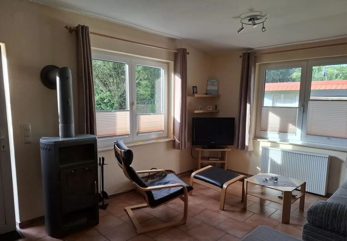 Der Wohnbereich ist mit einer Schlafcouch, einem Sessel, einem kleinen Tisch, dem Esstisch mit Stühlen, einem TV Gerät und einem Kaminofen ausgestattet. In der offenen Küche befindet sich ein Herd mit Backofen, eine Spüle, ein Kühlschrank mit zwei extra Tiefkühlfächern, ein Espressoautomat, ein Geschirrspüler, ein Wasserkocher, sowie Kaffeemaschine und Toaster. Hinter einer Wand ist eine Flurgarderobe und es gibt einen Schrank für Reinigungsmittel, einen Staubsauger und ein Bügeleisen. Das Bad ist mit Dusche, WC und Föhn ausgerüstet. In einem Schlafzimmer sind zwei Betten und ein Kleiderschrank, im Anderen steht ein Einzelbett. Vor dem Haus ist eine Terrasse mit Gartenmöbeln und Grill. Sie können den 1500 m² großen Naturgarten zum Sonnen oder für Spiele nutzen. Ein PKW - Parkplatz ist auf dem Grundstück vorhanden.