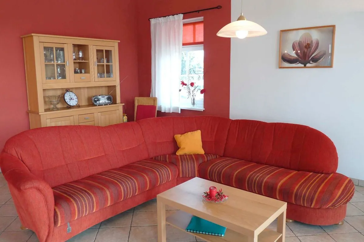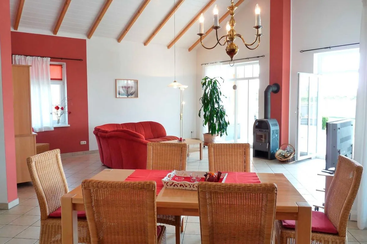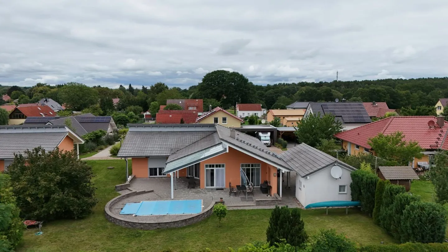 Das Ferienhaus in der Mecklenburgischen Seenplatte ist sehr komfortabel eingerichtet. Die Räume sind großzügig und lichtdurchflutet. Über ein paar Außenstufen gelangen Sie in den Flur. Dort sind eine Flurgarderobe und der Zugang zum Gäste-WC. Im großen Wohn- und Esszimmer gibt es eine offene Einbauküche mit einem Backofen, einem Cerankochfeld, einer Dunstabzugshaube, einem Geschirrspüler, einer Mikrowelle, einem Kühlschrank mit einem großen extra Gefrierfach, einer Kaffeemaschine, einem Toaster und einem Wasserkocher. Neben der Küche steht ein Esstisch mit Stühlen. Im Wohnbereich gibt es eine Eckcouch, einen kleinen Tisch, ein Buffet, ein TV-Regal, den Fernseher und einen Kaminofen. Über die großen Terrassentüren gelangen Sie nach draußen auf die Terrasse mit dem Pool und in den Garten. Das Bad ist ausgestattet mit einer ebenerdigen Dusche, einem Waschbecken mit Waschtisch, einer Badewanne, dem WC, einer Handtuchheizung und einem Föhn. Ein Schlafzimmer ist eingerichtet mit einem Doppelbett, einem Kleiderschrank, einem Stuhl, einer Kommode, einem Fernseher und dem Babybett. Im zweiten Schlafzimmer sind ebenfalls ein Doppelbett, ein Kleiderschrank, eine Kommode, ein weiterer Fernseher und ein Stuhl. Im Heizungs- und Abstellraum des Hauses haben Sie Platz für Ihre Vorräte und Koffer. Sie finden hier einen Trockner, ein Bügeleisen, ein Bügelbrett und Spielzeug für draußen und den Pool. Das Ferienhaus ist komplett über eine Fußbodenheizung beheizbar. Gemütliche Abende können Sie auch am Kaminofen verbringen, Holz ist vorhanden. Im Haus finden Sie einige Bücher, Gesellschaftsspiele und Informationsmaterial zur Planung Ihrer Unternehmungen. Auf der Terrasse stehen Gartenmöbel, eine Sonnenliege, ein Grill und ein Lagerfeuerkorb für Sie bereit. Auf dem Grundstück sind drei Parkplätze vorhanden.